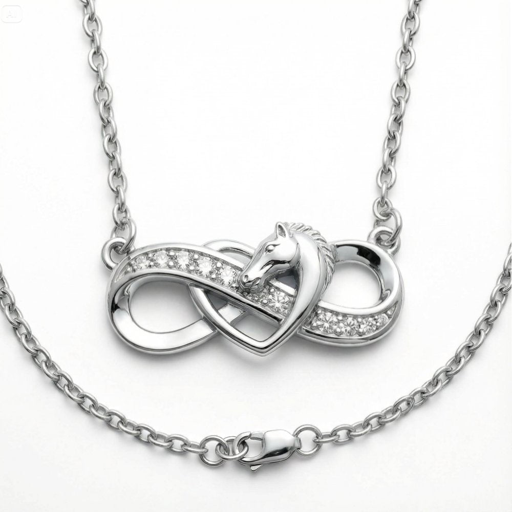 Ajoutez une touche d’élégance intemporelle avec ce magnifique collier pendentif. Un bijou qui allie le précieux de l’argent et la brillance des cristaux de zirconium. Son motif infini entrelacé d'un coeur et d'un cheval en fait une pièce unique qui attire le regard racontant une histoire d'amour et de passion avec le cheval.